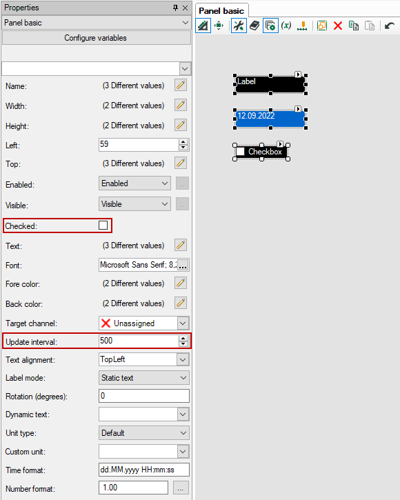 In the following example, the properties “Checked” and “Target channel” belong to the check box object. They do not apply to the text field objects.