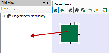 Ziehen Sie im Entwurfsmodus ein Objekt vom Panel mit gedrückter Maustaste in den leeren Bereich im Bibliothekenfenster. Automatisch wird eine neue Bibliothek angelegt, die das Objekt enthält.