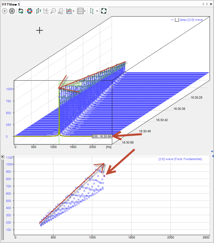 Die Marker-Spektrum-Anzeige dient zur Darstellung der Beziehung zwischen einem dynamischen Marker (horizontale Achse in Hz) und dem zugehörigen Spektrumwert (vertikale Achse).