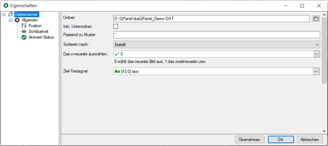 Mit dem Dateiscanner kann ein Verzeichnis nach einer neuen oder geänderten Datei überwacht werden. Die gefundene Datei wird mit dem gesamten Pfad in einem Ziel-Textsignal gespeichert. Die Suche ist nicht auf DAT-Dateien beschränkt, sie kann auch andere Dateiformate berücksichtigen. Darüber hinaus kann definiert werden, ob die neueste oder zweitneueste etc. Datei in das Textsignal gespeichert wird. Das Ziel-Textsignal kann dann verwendet werden, um beispielsweise die gefundene Datei in einer Offline-Trendkurve anzuzeigen oder den Namen in einem Textfeld anzuzeigen. Für jede zu findende Datei muss ein eigener Dateiscanner konfiguriert werden.