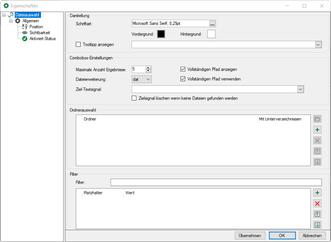 Im Feld Filter geben Sie ein Muster vor, das der Dateiname enthalten soll oder eine Dateiendung. Erlaubt sind auch Platzhalter, wie * und ? und konfigurierte Platzhalter. Platzhalter werden durch Textsignale gefüllt.