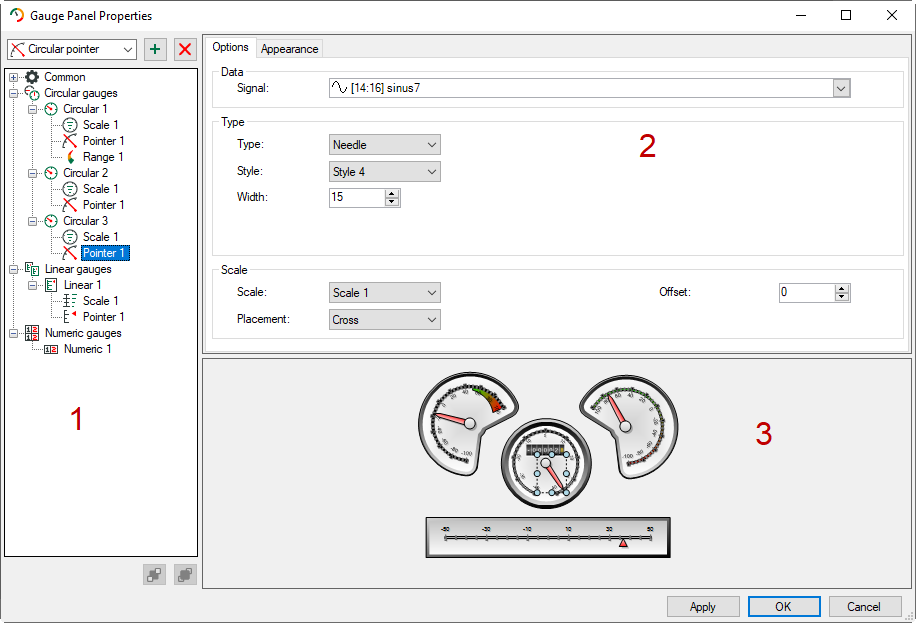 The properties tree (1) shows the hierarchical structure of the elements in the gauge panel.