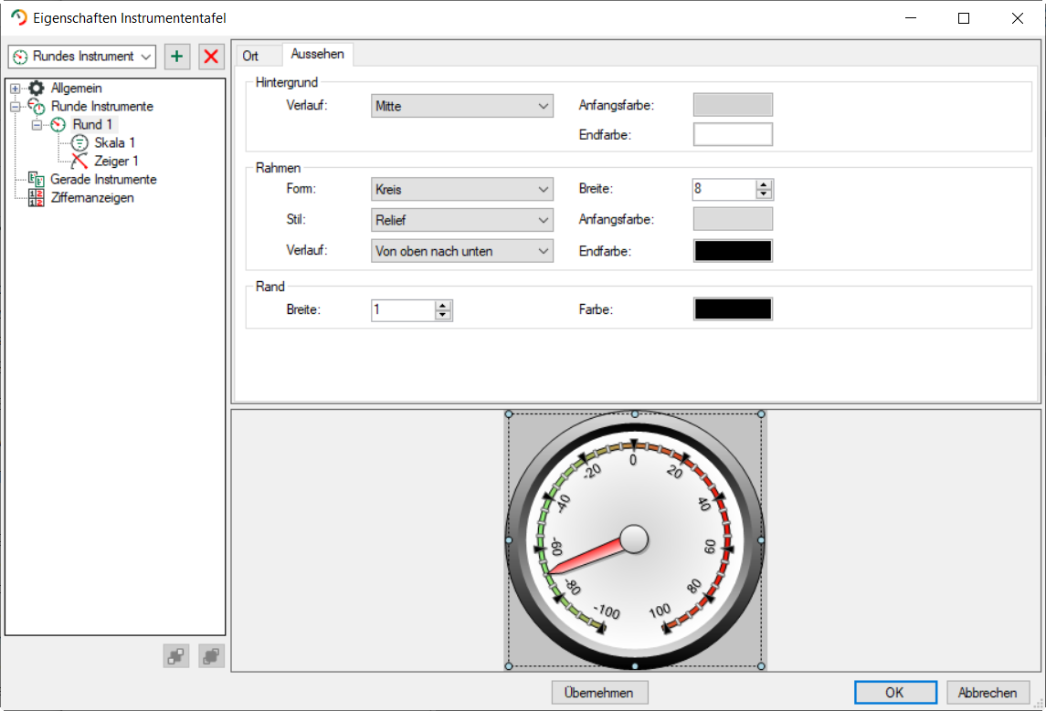 Die Rahmenform Autoform schmiegt sich so eng wie möglich um die eingestellte Skala. Erstreckt sich die Skala im Beispiel oben bei einem runden Instrument nur über einen halben Kreis, nimmt der Rahmen auch die Form eines Halbkreises an. Der Dialog Aussehen für gerade Instrumente und Ziffernanzeigen entspricht dem der runden Instrumente.
