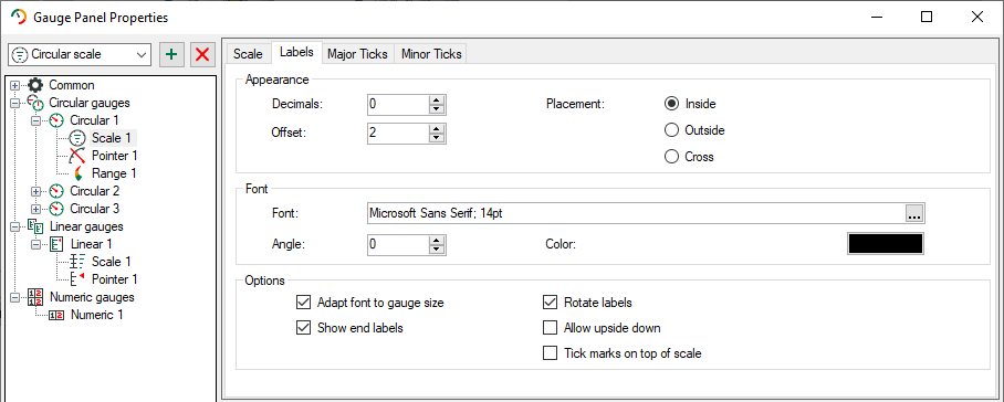In the dialog Labels, the properties for scale labeling are defined like font, color, position of the scale, etc. All chosen properties can be checked in the preview window.