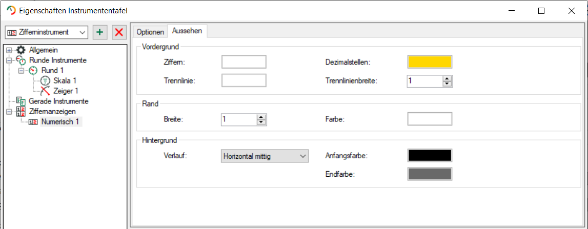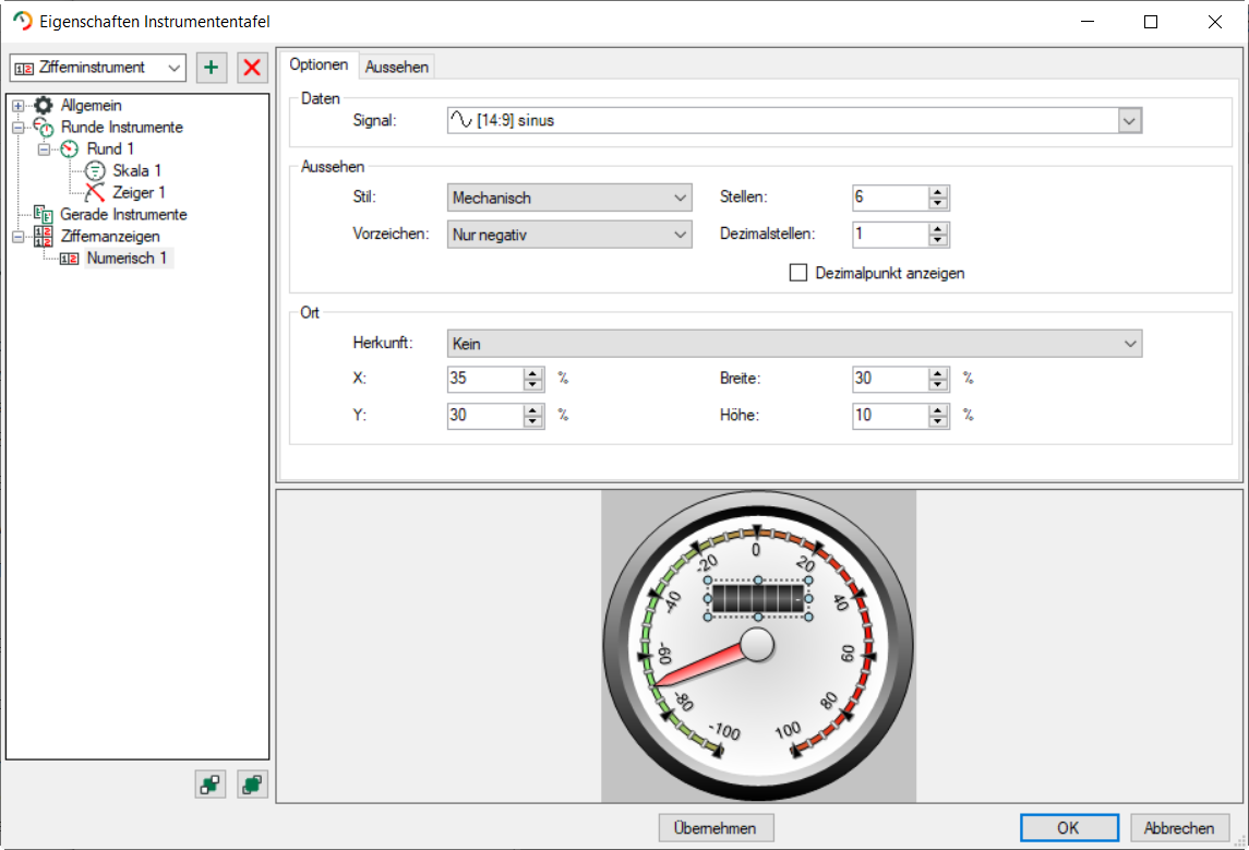 Im Bereich Daten wählen Sie zunächst das Signal aus, dessen Werte angezeigt werden soll. Im Bereich Aussehen können Sie aus verschiedenen Anzeigestilen auswählen, die angezeigten Stellen und Dezimalstellen angeben, sowie vorgeben, wann Vorzeichen angezeigt werden. Im Bereich Ort definieren Sie Position und Größe der Ziffernanzeige. Diese Angaben werden in Prozent angegeben und können sich auf ein bereits angelegtes Instrument beziehen. Dieses Instrument wählen Sie bei Herkunft aus.