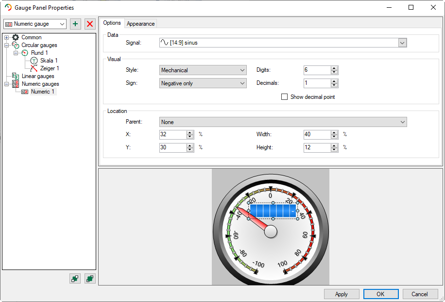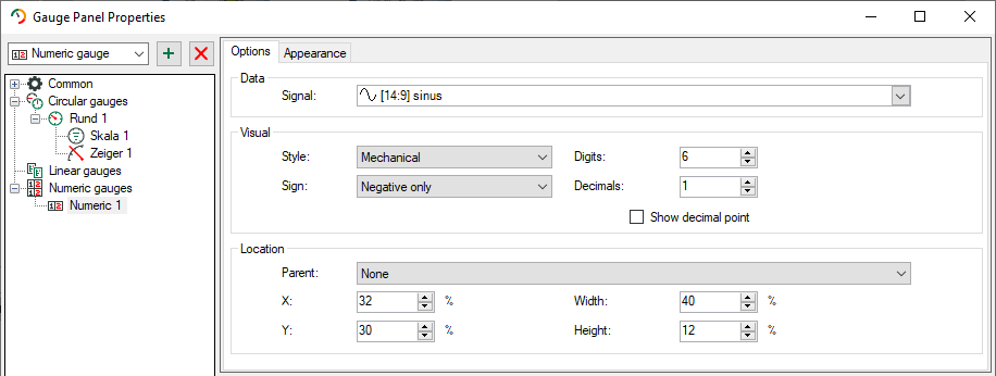 You choose the signal which values shall be displayed in the section Data. In the section Visual, you can select different display styles, specify digits and decimals as well as indicate when the signs are displayed. In the section Location you define position and size of the numeric display. These information will be indicated in percentage and can refer to an already configured gauge. You can select this gauge with Parent.
