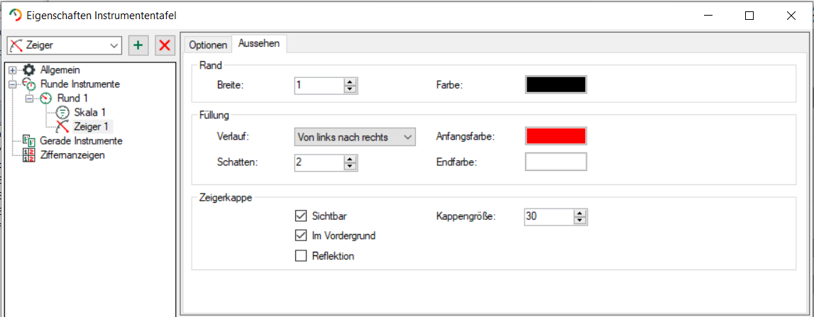 Die Beschreibung der Zeigereigenschaften erfolgt hier am Beispiel der runden Instrumente. Die Einstellungen für gerade Instrumente sind ähnlich.