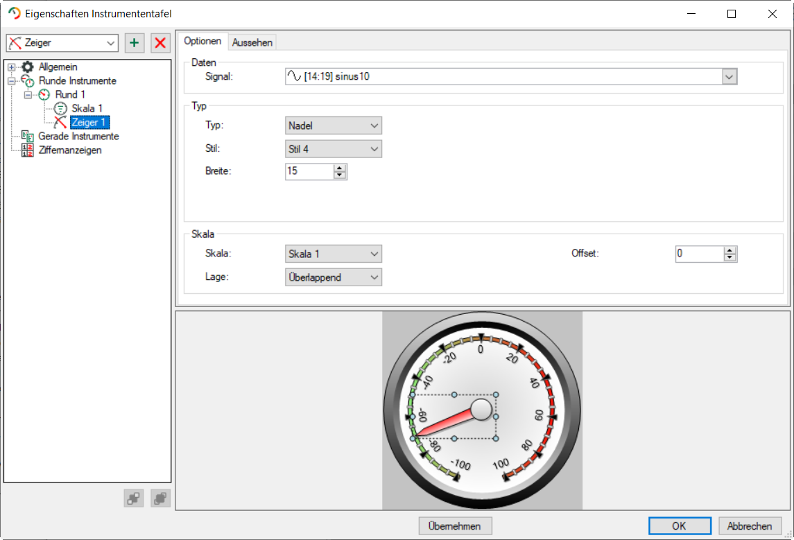 Im Bereich Daten wählen Sie zunächst das Signal aus, dessen Werte angezeigt werden sollen. Im Bereich Typ können Sie aus verschiedenen Darstellungsformen auswählen und die Breite einstellen. Im Bereich Skala können Sie den Zeiger einer Skala zuweisen und die Lage im Instrument anpassen. Ist im Instrument noch keine Skala angelegt, ist der Zeiger nicht sichtbar.