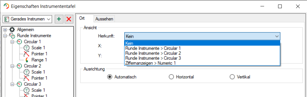 Für gerade Instrumente kann im Dialog Ort zusätzlich die Ausrichtung ausgewählt werden. Mit der Einstellung Automatisch richtet sich die Ausrichtung nach der unter Ansicht eingestellten Höhe und Breite.