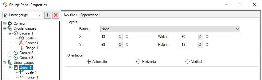 The Location tab appears when an instrument is selected on the left side of the tree. Position and size will be defined in percentage. The percentage value can also refer to another element which is chosen with Parent. If None is chosen, the element itself is the reference size.