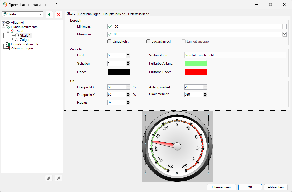 Der Drehpunkt befindet sich im Mittelpunkt der Skala. Die Skala selbst kann innerhalb des Instruments verschoben werden. Mit den X- und Y-Werten von 50% ist die Skala in der Mitte des Instruments positioniert. Der Anfangswinkel wird vom untersten Punkt der Skala berechnet, der Skalenwinkel wird vom Anfangswinkel aus berechnet.