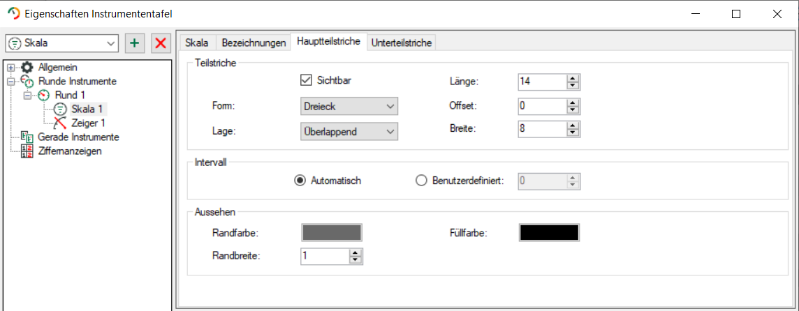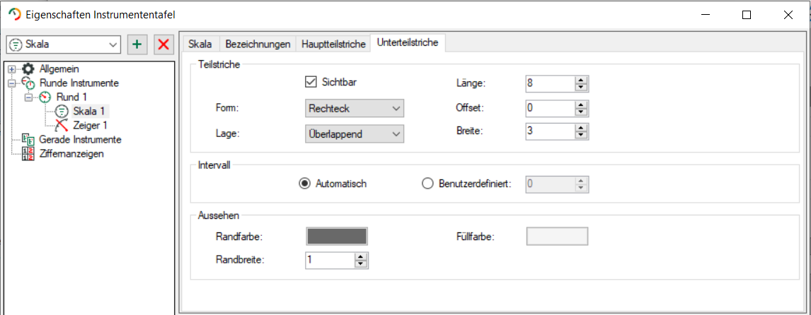 In den Registern Hauptteilstriche und Unterteilstriche werden die Eigenschaften der Teilstriche eingestellt. Die Teilstriche können in Form, Farbe, Lage und Größe variieren. Alle gewählten Eigenschaften können im Vorschaufenster überprüft werden.