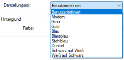 Hier wird die Aktualisierungszeit der Anzeige eingestellt, die Hintergrundfarbe und die Hintergrundfarbe beim Drucken. Der Darstellungsstil kann individuell definiert werden, oder aus einer Reihe vordefinierter Stile ausgewählt werden.