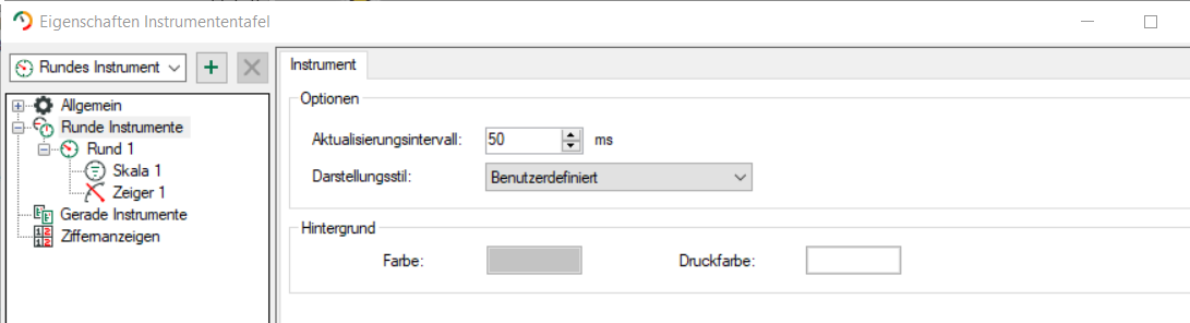Ist einer der drei Instrumentenzweige (Runde bzw. gerade Instrumente oder Ziffernanzeige) markiert, öffnet sich folgender Dialog: