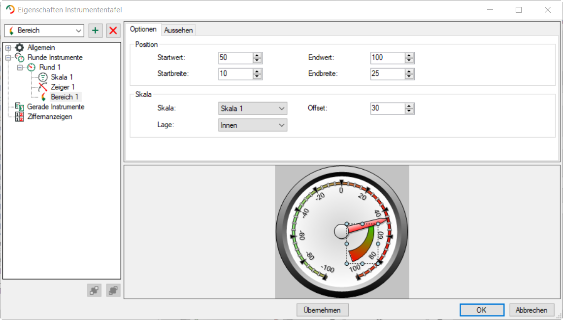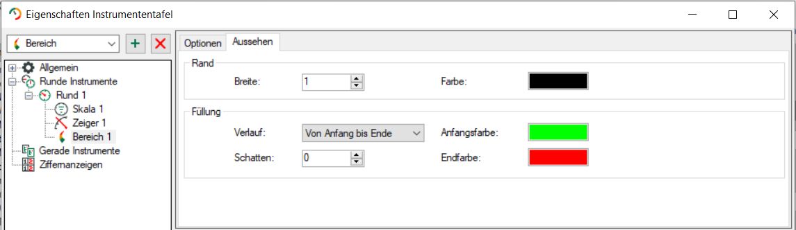Ein Bereich kann zusätzlich zu einer Skala angezeigt werden. Start- und Endwert beziehen sich auf die Werte der Skala. Die Position des Bereichs bestimmen Sie über Lage und Offset. Ohne Skala ist der Bereich nicht sichtbar.