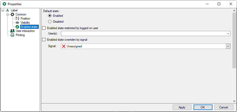 An object can be enabled or disabled, or the enabled state can be controlled by a signal or user. User selection, see previous chapter Visibility.