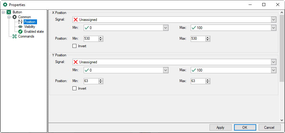 The position can be configured with dynamic values along the X and Y-axes. The values at min. and max. refer to the value range of the signal. This will be scaled with the min./max. position. Reference point is the left upper corner of the object.