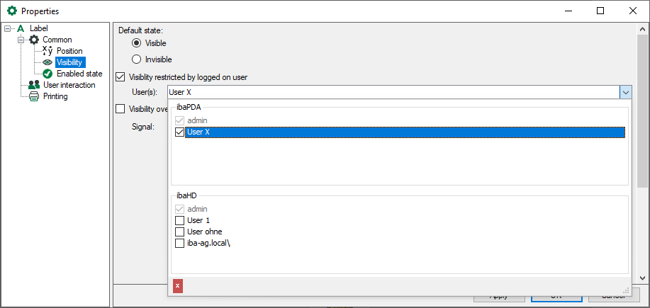 It is possible to choose several users which are allowed to see this object. All users created in the user management can be chosen via a drop-down list. The administrator always sees all elements.