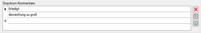 Sie können im Kommentardialog eine Benutzereingabe zulassen oder in der Liste Drop-down-Kommentare Kommentare definieren, aus denen dann einer im Drop-down-Menü des Kommentardialogs ausgewählt werden kann. Klicken Sie auf eine Zeile und geben einen Kommentar ein. Mit den Buttons rechts neben der Liste können Sie markierte Kommentare wieder löschen (x) oder die Reihenfolge mit den Pfeilen verändern.