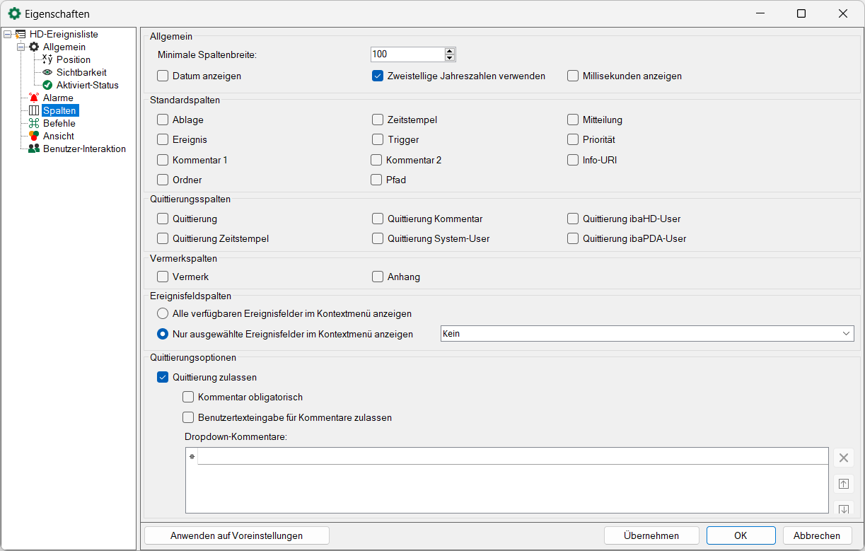 Hier wählen Sie aus, welche Spalten in den Ereignistabellen angezeigt werden sollen.