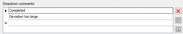 You can allow user input in the comments dialog, or define comments in the “Drop-down comments” list, which can then be selected in the comment dialog's drop-down menu. Click on a line and enter a comment. You can use the buttons to the right of the list to delete selected comments (x) or change their order via the arrows.