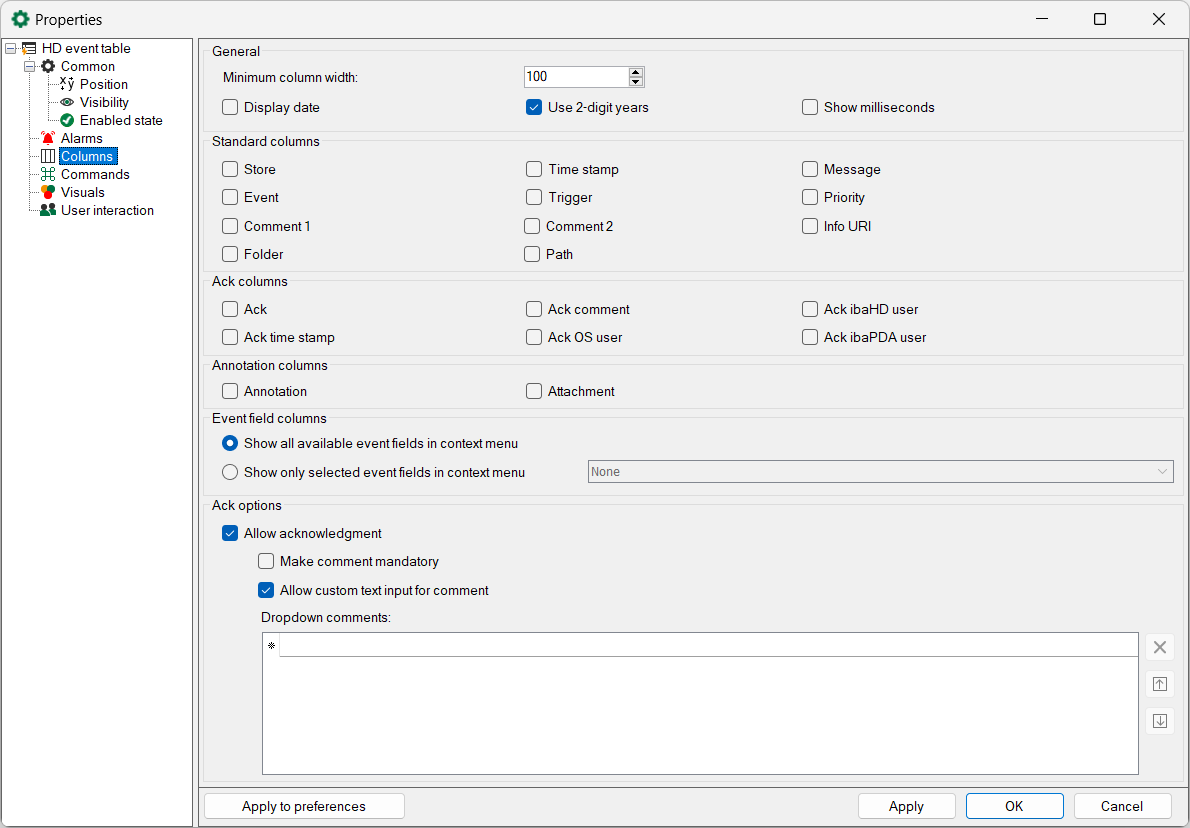 Enable this option to be able to acknowledge messages in the event table. If you disable this option, then a mouse click in the column Acknowledgment does nothing.