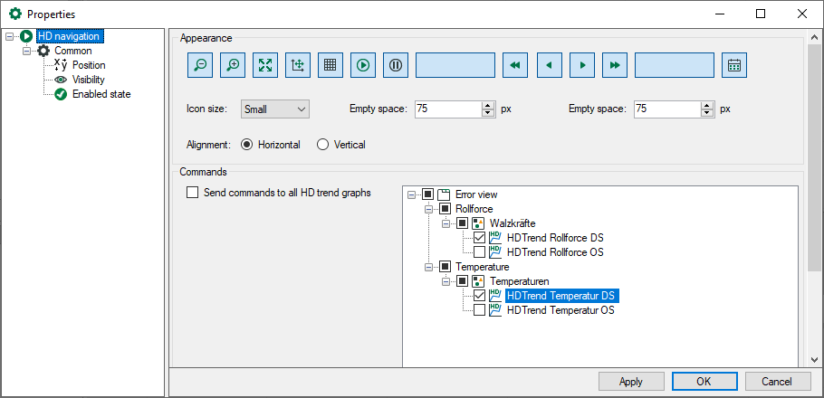 Here, you can choose the HD trend graph to be controlled via HD navigation. When the option Send commands to all HD trend graphs is enabled, all HD trend graphs will be operated with one HD navigation.