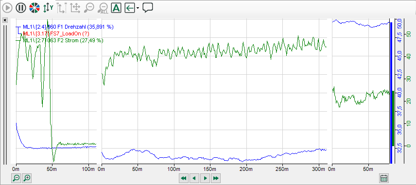 With the pause signal, the signal curve can also be frozen. If the signal is permanently TRUE (1), the curve will be "freezed". If the signal is on FALSE (0) for a short time (impulse with corresponding length), the display jumps to the current time and will be "freezed" again after the FALSE impulse sequence. |