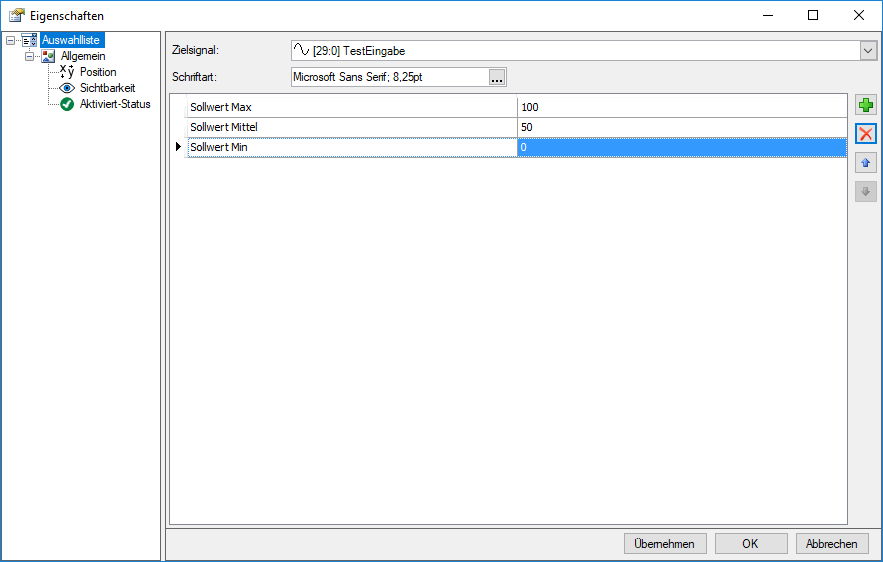 Mit der Auswahlliste können Werte aus einer Drop-down-Liste in Textform ausgewählt und auf ein Signal geschrieben werden.