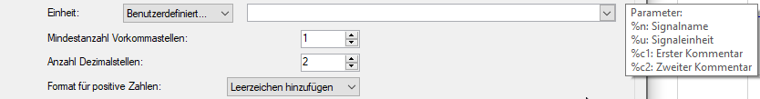 Dynamischer Text: Der Wert eines ausgewählten Signals wird angezeigt. Das Signal wird aus der Auswahlliste des Optionsfeldes ausgewählt. Außerdem wird das Format der Anzeige, wie Vorkommastellen, Dezimalstellen, festgelegt. Als Einheit kann die Default-Einheit oder eine benutzerdefinierte angezeigt werden. Sie können einen festen Text eingeben oder dynamisch mit Platzhaltern steuern.