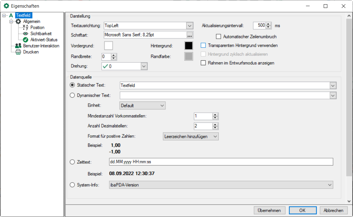 Die Textfelder in ibaQPanel können sowohl statische als auch dynamische Texte darstellen. Um dynamische Texte anzuzeigen, kann man ein Messsignal oder einen Textsignal-Abschnitt verwenden. Mit dem Textfeld können auch Datum, Uhrzeit oder Systeminformationen angezeigt werden. Mit der Aktualisierungszeit wird bestimmt, wie oft das Textfeld aktualisiert wird.