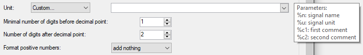Dynamic text: The value of a selected signal is displayed. The signal will be chosen from the picklist of the option field. Furthermore, the format of the display, as pre-decimal digits or decimals is determined. The default unit, or a custom one, can be displayed as the unit. You can enter a fixed text or control it dynamically with placeholders.