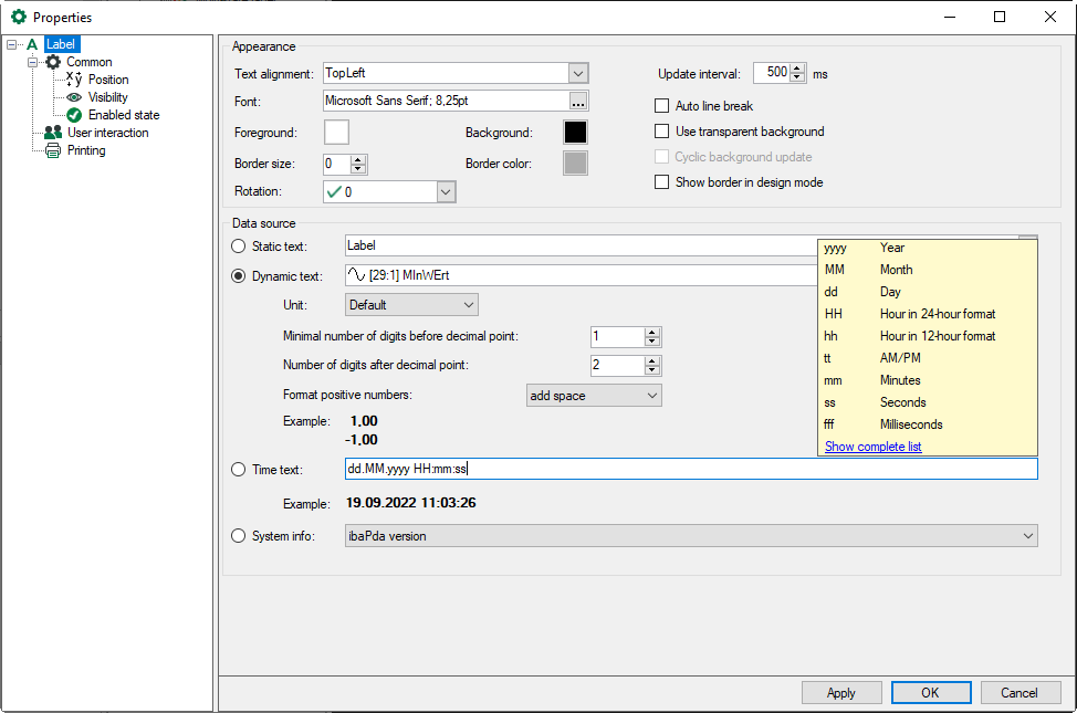 The labels in ibaQPanel can display not only static but also dynamic texts. To display dynamic texts, use a measured signal or a text signal section. Date, time or system information can be displayed in the label. The update time determines how many times the label will be updated.