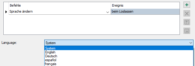 Die Sprachumschaltung lässt sich auch mit dem Button-Objekt steuern. Verwenden Sie den Befehl Sprache ändern, siehe Kapitel Button.