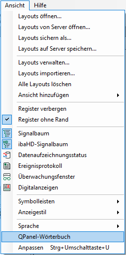 In ibaPDA kann die GUI-Sprache über den Menü-Befehl Ansicht - Sprache umgeschaltet werden. Standardmäßig stehen Deutsch, Englisch und Französisch zur Verfügung. Weitere Sprachen hängen vom installierten Sprachpaket ab. In ibaQPanel kann die Sprache von textbasierten Objekten mit der Sprachumschaltung in ibaPDA ebenfalls umgeschaltet werden. Voraussetzung hierfür ist, dass der zu den Objekten gehörende Text in den unterschiedlichen Sprachen in einem Sprachwörterbuch vorhanden ist.