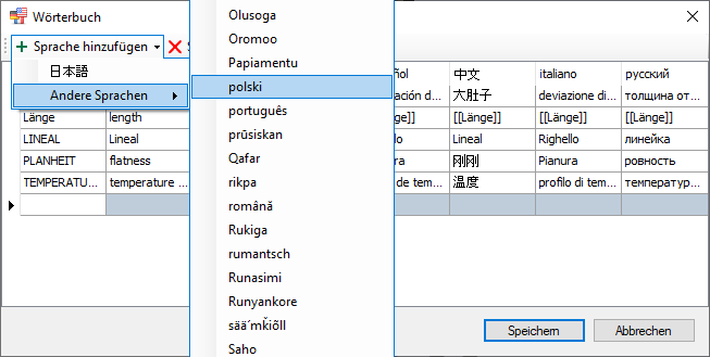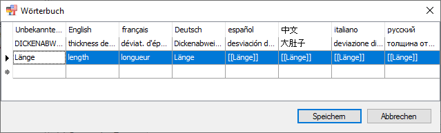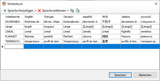 Im Wörterbuch können Einträge bearbeitet, hinzugefügt und gelöscht werden, sowie neue Sprachen hinzugefügt und bestehende Sprachen gelöscht werden. Einen neuen Eintrag können Sie in die leere Zeile eingeben. Einen bestehenden Eintrag können Sie direkt in der Zelle bearbeiten.