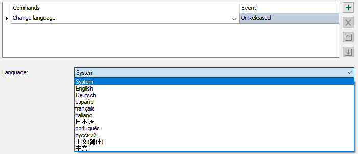 The language switch can be controlled by the button object, too. For this purpose, the Change language command is available, see chapter Button.