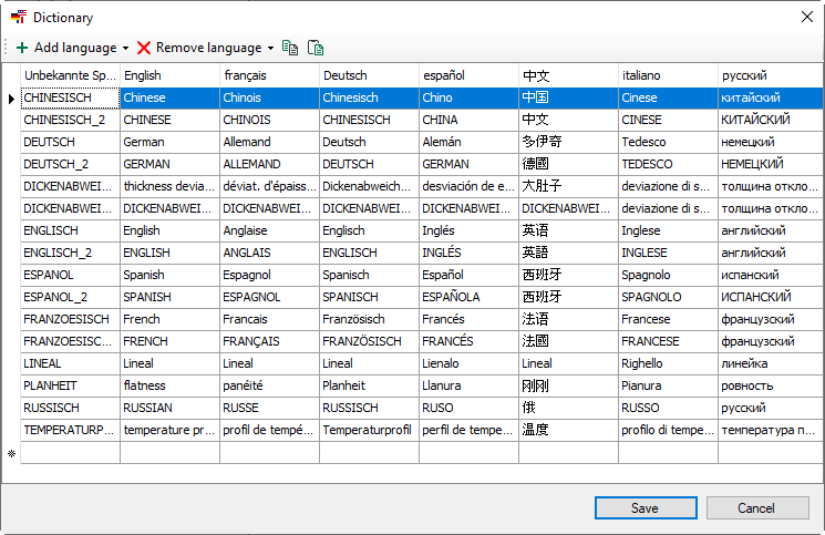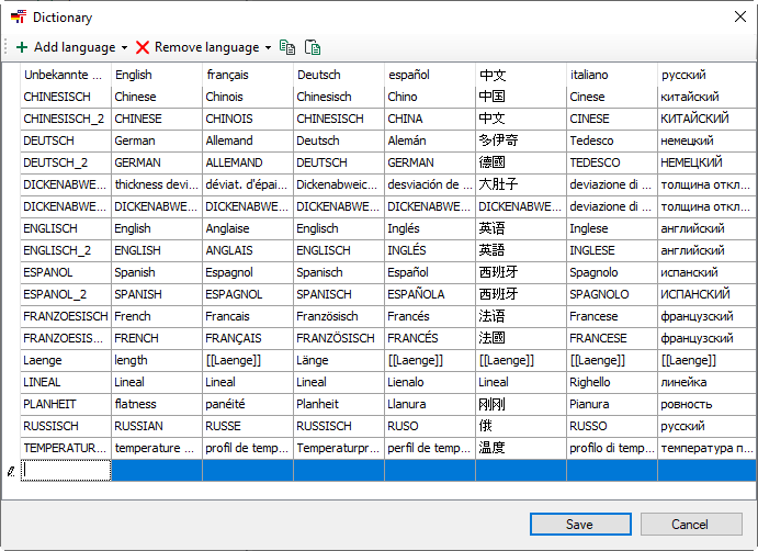 In the dictionary, you can edit, add and delete entries as well as add new and delete existing languages. You can enter a new entry in the empty line. You can edit an existing entry directly in the line.