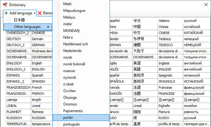 When adding a new language, numerous supported languages are available for selection in the Other languages submenu. You can also add these languages to the dictionary.