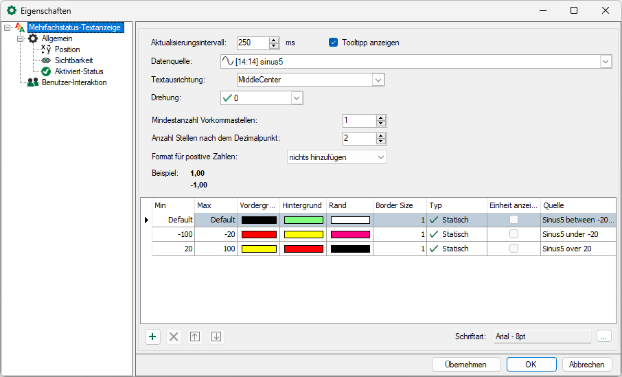 Im Feld Datenquelle wählen Sie das Signal aus, dessen Status angezeigt werden sollen. Das Aktualisierungsintervall können Sie in ms eingeben.