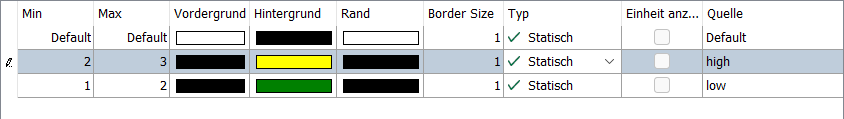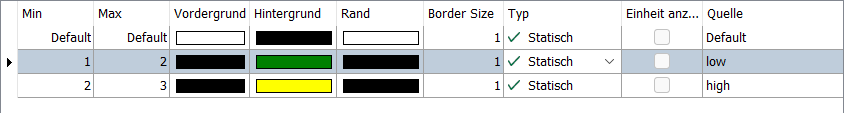 Hat das Quellsignal den Wert 2, gibt es die erste Übereinstimmung in der zweiten Zeile. D. h. mit der folgenden Konfiguration wird "low" auf grünem Hintergrund angezeigt.