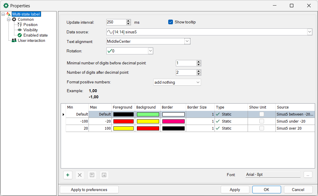 The multi-state label in ibaQPanel can show different texts and colors dependent on the state of a digital or analog state signal. The state is defined as value range. It is possible to assign a static text or text signal section to each state.