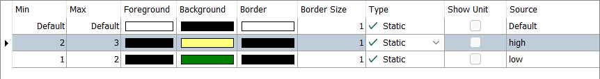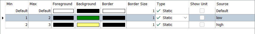 If the source signal in the example below has a value of 2, the first match is in the second row. This means that with the following configuration, “low” is displayed on a green background.