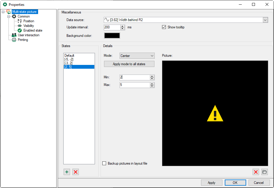 Besides the Min and Max values, each state can be assigned to a mode (picture display as with the element Picture) and a picture. The mode can be applied by clicking on the button <Apply mode to all states>.