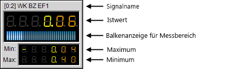Die digitale Ziffernanzeige gibt den Istwert eines Analogsignals wieder. Optional kann die Anzeige von Minimal- und Maximalwert eines Signals gewählt werden (rücksetzbar). Ein Bereichsbalken kann angezeigt werden, der die Position des aktuellen Werts zwischen dem minimalen und maximalen Signalwert zeigt. Minimal- und Maximalwert, sowie der Bereichsbalken können im Kontextmenü aktiviert/deaktiviert werden.