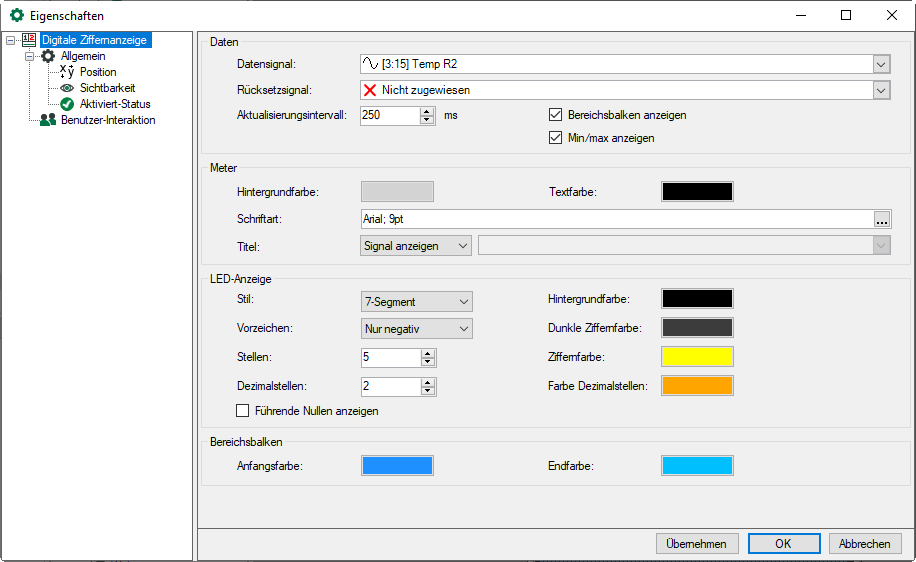 Hier legen Sie Stil und Format der Wertanzeige fest. Sie können wählen zwischen 7- und 14-Segmentanzeige, die Anzahl der Stellen und Dezimalstellen definieren und Farben einstellen.