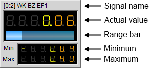 The numeric digital display shows the actual value of an analog signal. Optionally, it can show the minimum and maximum values of a signal (resettable). It can also show a range bar showing the position of the current value between the minimum and maximum signal value. Minimum and maximum value as well as the range bar can be enabled or disabled in the context menu.