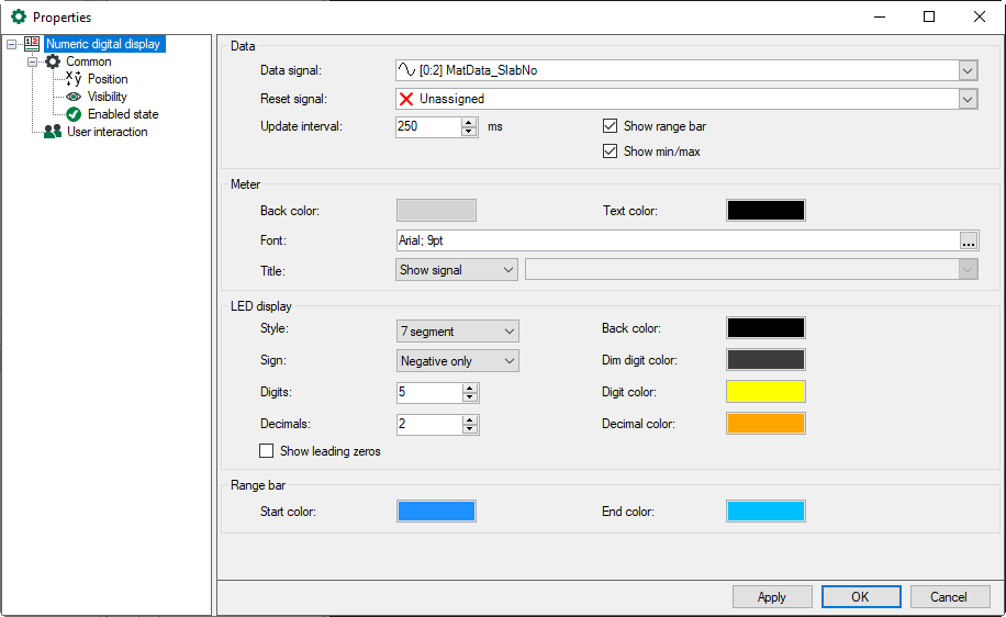 Here you define the analog signal whose value is shown in the digital numeric display. You can select a digital signal as reset signal which resets the minimum and maximum value of the display. The update interval determines the update rate for the display. You can enable the display of the range bar as well as the display of minimum and maximum value of the signal.