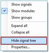 The signal tree can be shown or hidden via the context menu of the signal tree and the trend graph or via a button in the toolbar of the trend graph.