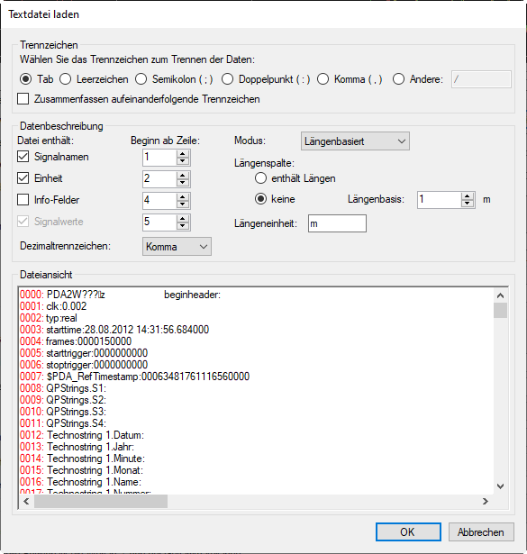Bei längenbasierten Daten können Sie auswählen, ob eine Spalte für die Länge enthalten ist. Ohne Längenspalte muss die Längenbasis angegeben werden, außerdem können Sie eine Einheit angeben. Mit <OK> oder <Übernehmen> wird die Textdatei geladen.